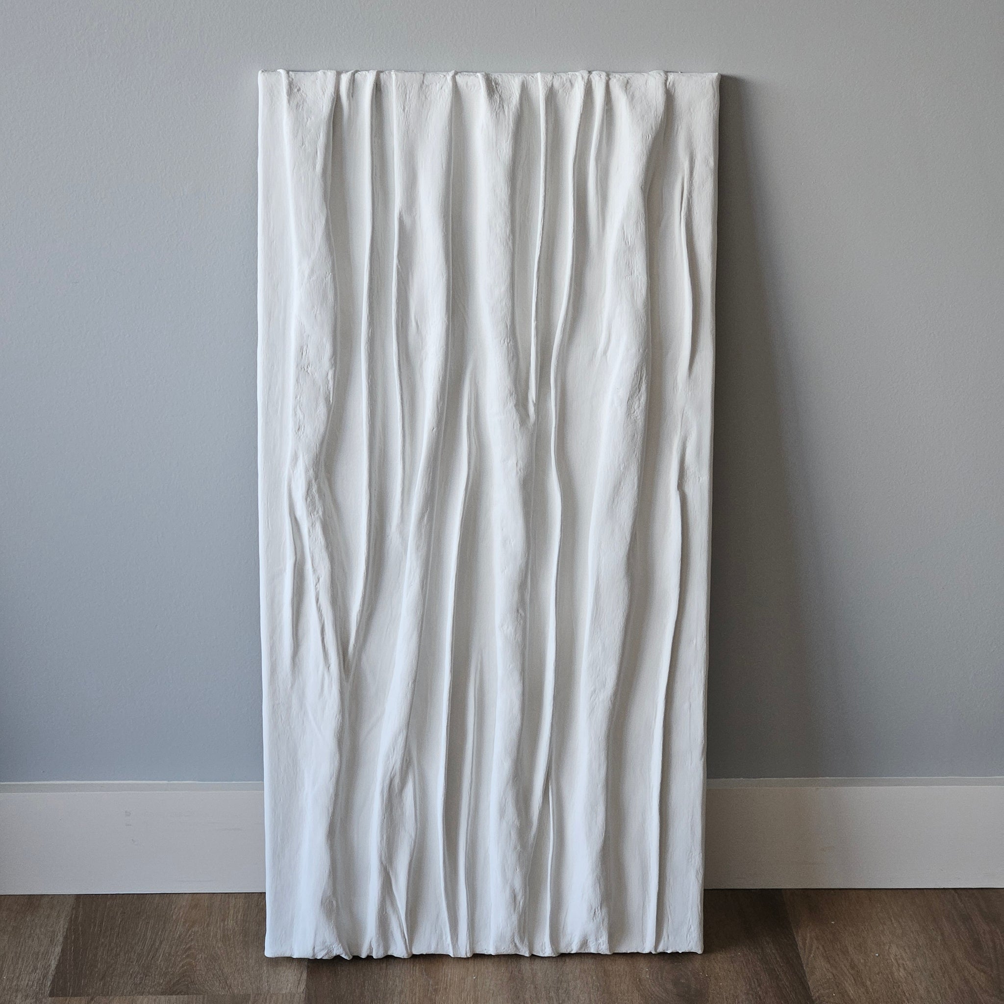 This artwork was created by dipping French linen fabric into a plaster mixture and arranging it on a canvas board in various linear patterns.