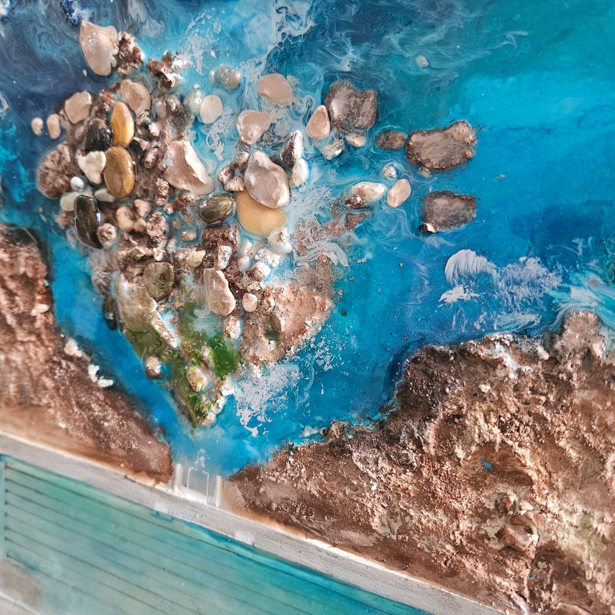 This piece is created using a combination of real beach sand from Sydney beaches, acrylic paint, and resin.