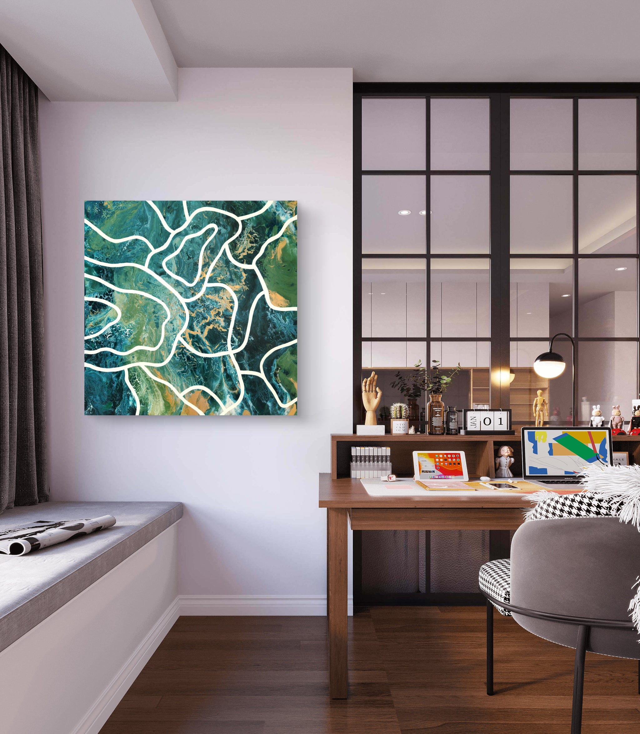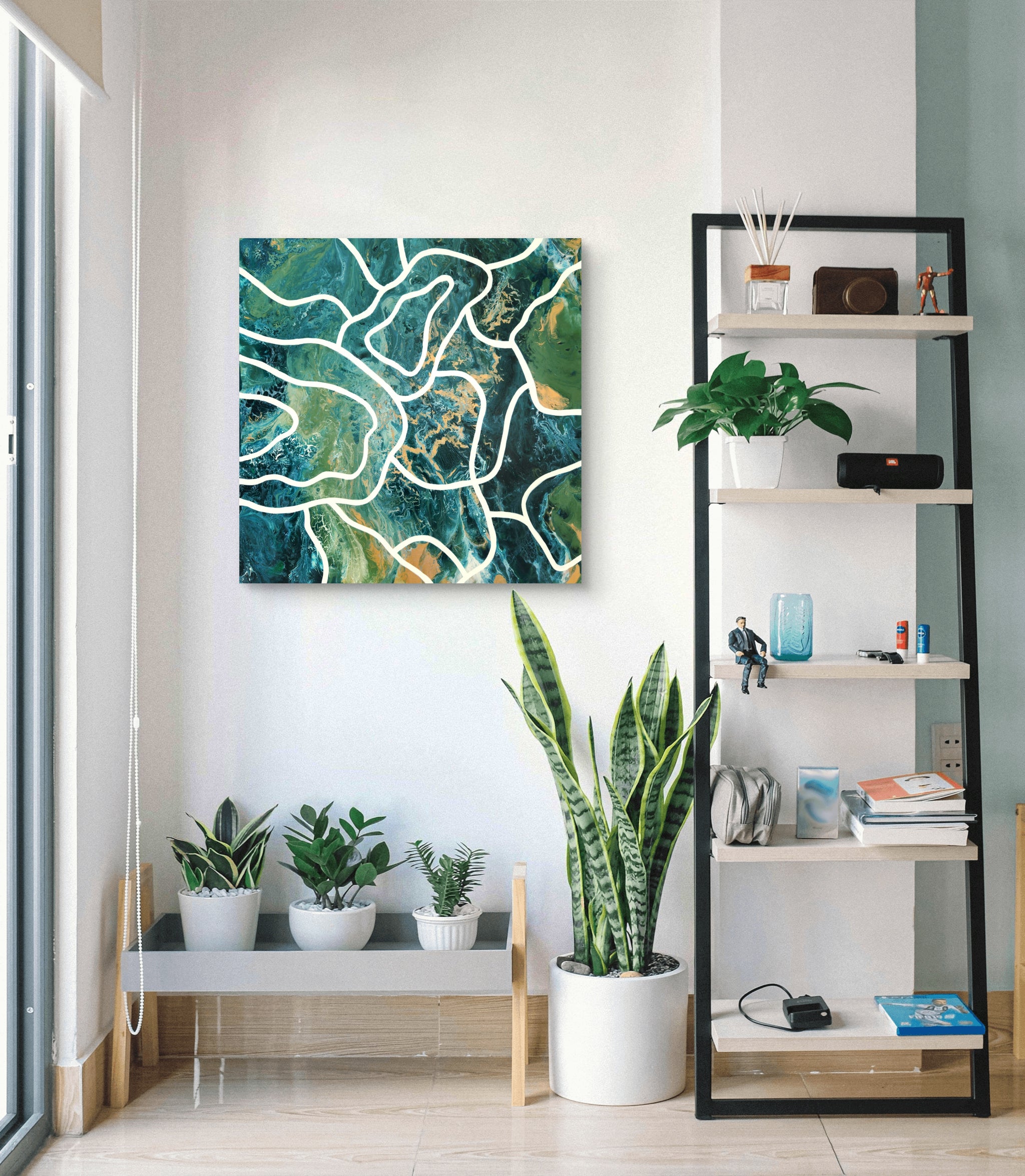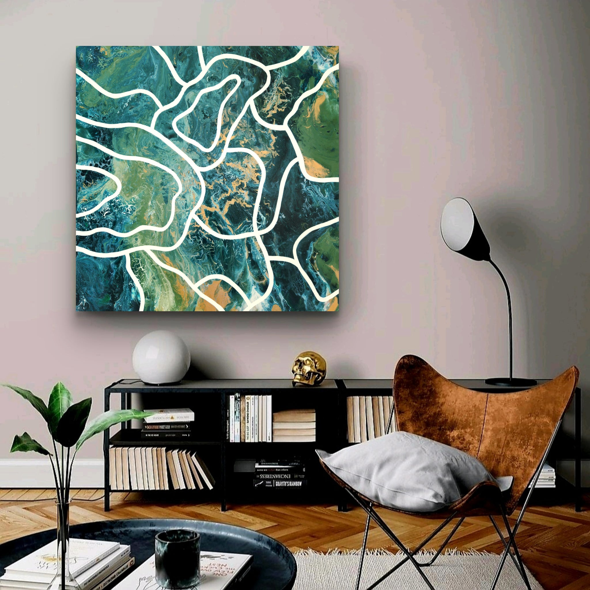 This abstract acrylic painting captures the organic energy of nature through flowing green tones, vibrant golds, and deep textures. White lines wind across the surface like rivers or root systems, suggesting hidden connections and natural rhythms.