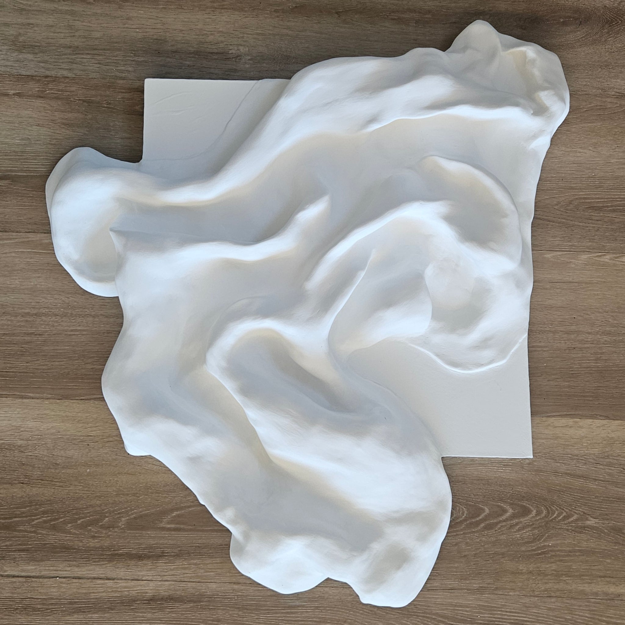 Gentle, fabric-like forms rise from a smooth surface, creating a serene flow of texture and depth.