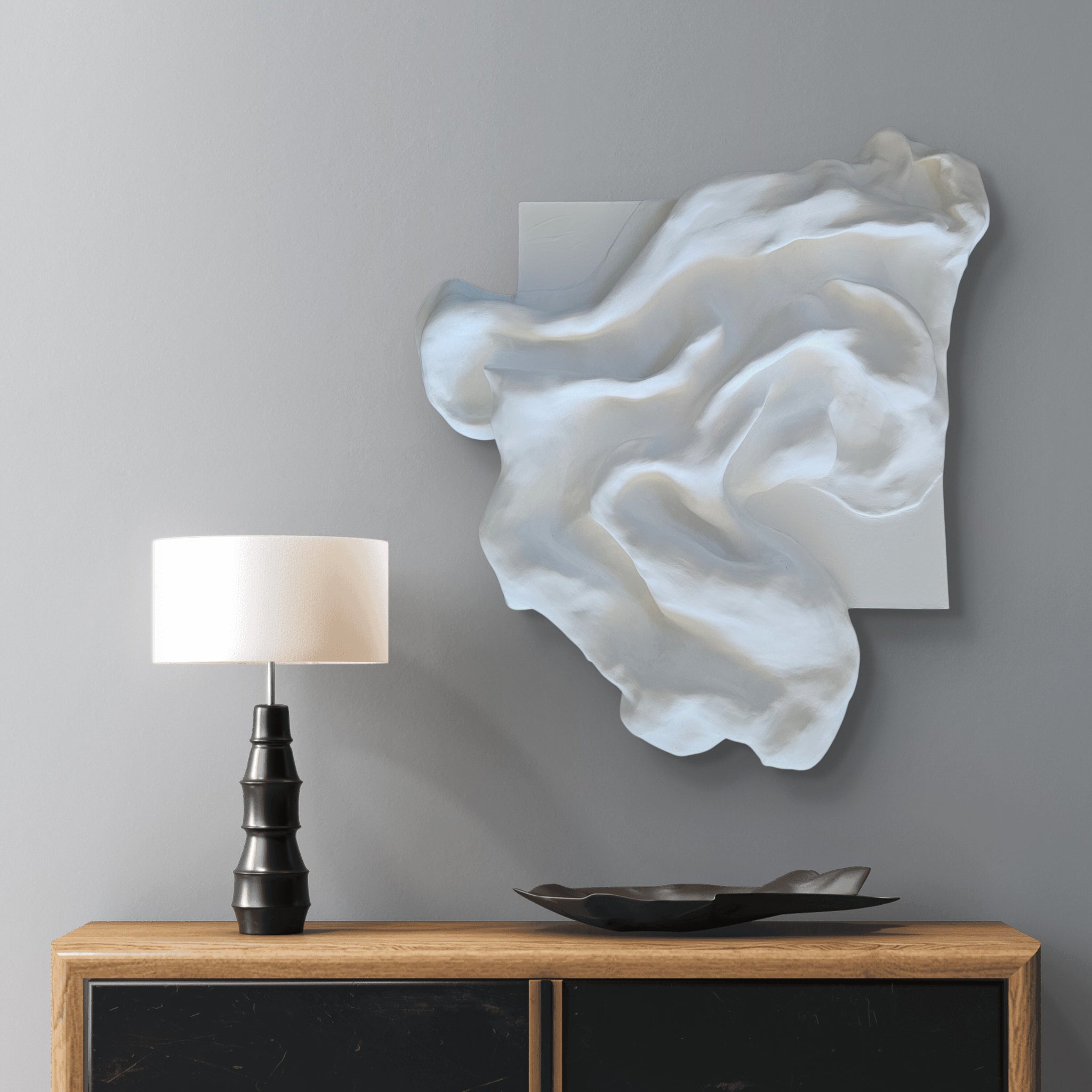 As light moves across it, soft shadows shift along the contours, giving the artwork a quiet, ever-changing presence.